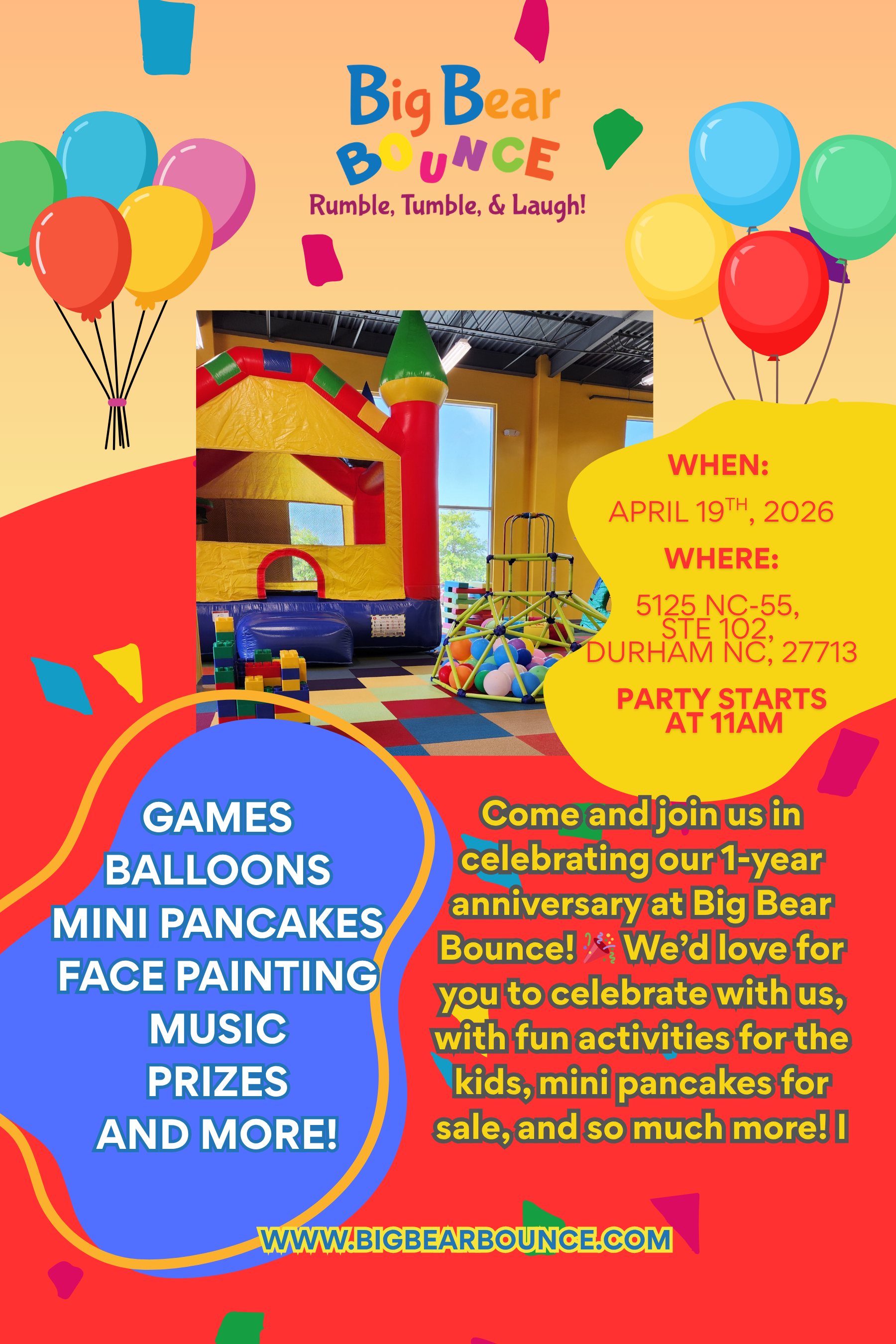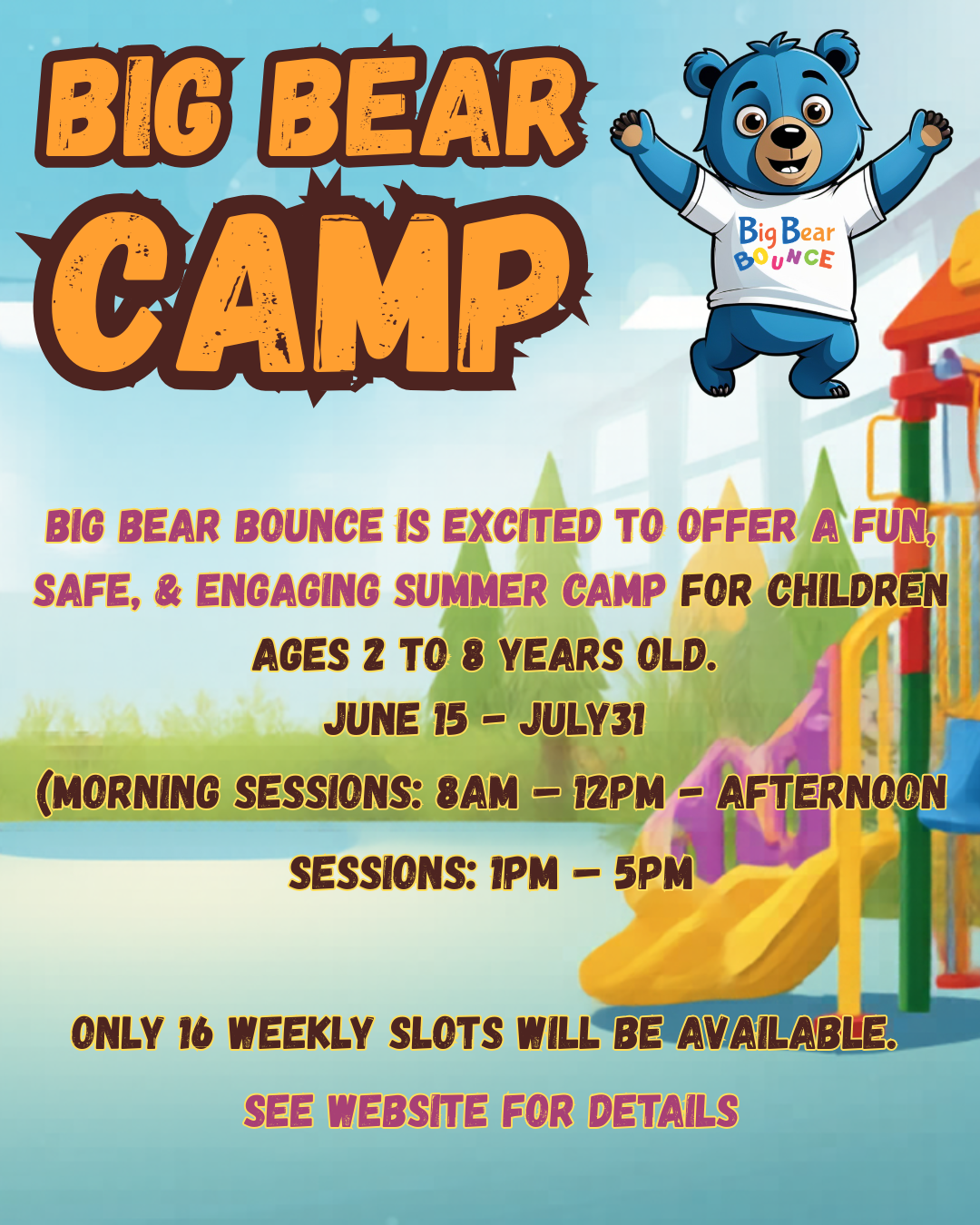 Come and release your JOY!!! Our playground is your ultimate destination for safe, friendly, and exciting adventures. At Big Bear Bounce, we pride ourselves on keeping everything clean, cozy, and bursting with energy. Come jump, play, and make memories in a place where smiles are endless, and safety always comes first! 🐻✨